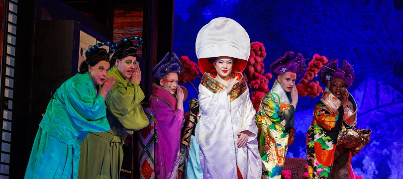 Butterfly, her colleagues, and family arrive for the wedding. She tells Pinkerton that since her father’s death, she now earns her living as a geisha. She also has secretly converted to Christianity. The Imperial Commissioner performs the marriage ceremony. Then, Cio-Cio-San’s uncle, the Bonze, bursts in. He curses her, inciting the crowd. Protecting Butterfly, Pinkerton orders the guests away. Butterfly weeps and her new husband consoles her. As night falls in this pleasure fantasy, the lovers share a moonlit duet.